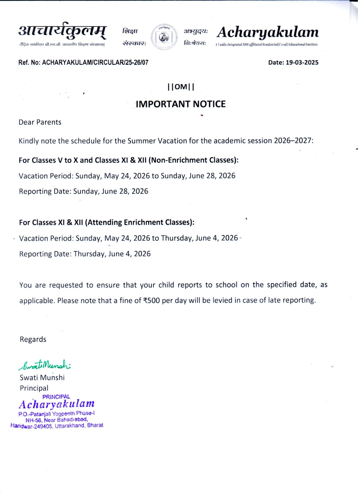 Under the spiritual and divine guidance of Param Pujya Yogrishii Swami Ramdev Ji and Param Shraddhey acharya Balkrishna ji, Acharyakulam nurtures its students in the divine and spiritual vicinity along with ultra-modern education. We, at Acharyakulam aim at preparing fully awakened and conscious scholars, who will be prepared through the confluence of wisdom and ultra-modern scientific knowledge.