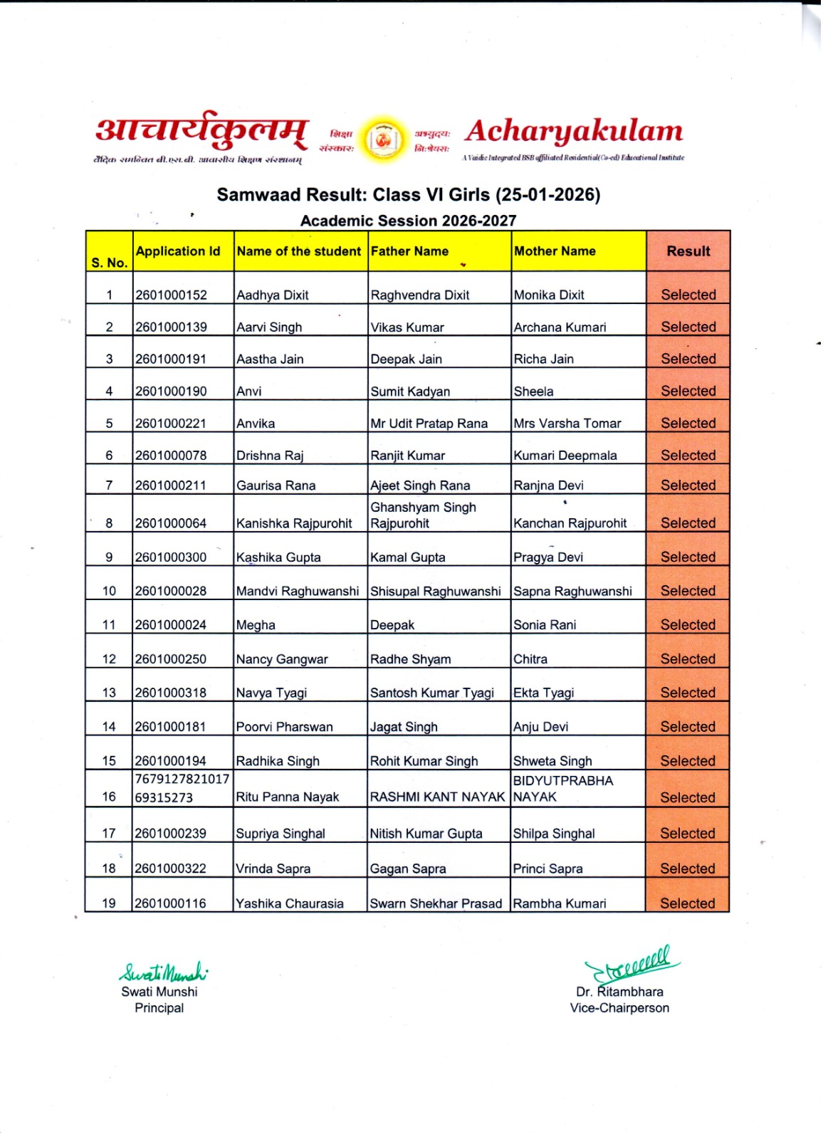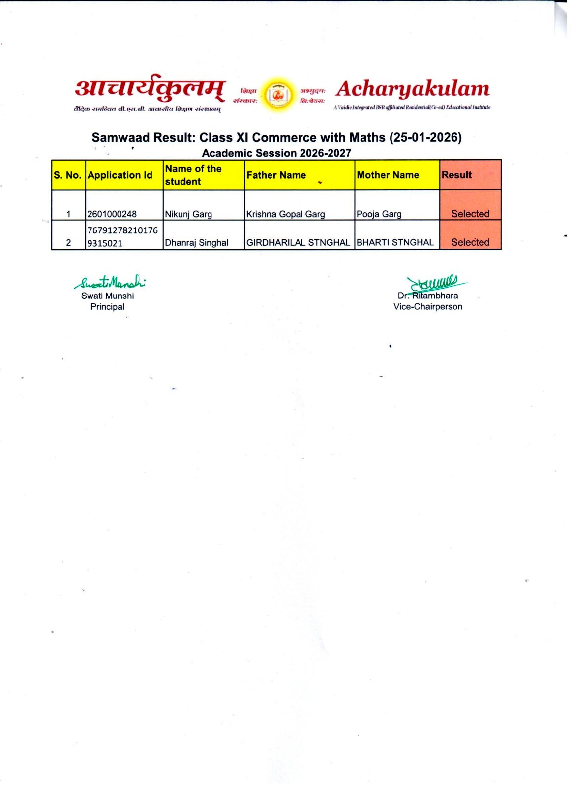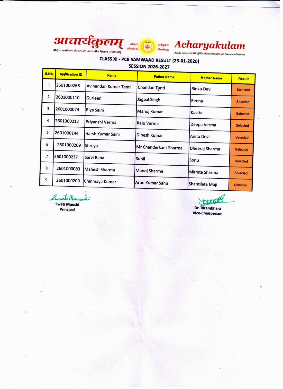 Entrance Exam Result ( 2026-01-25 )